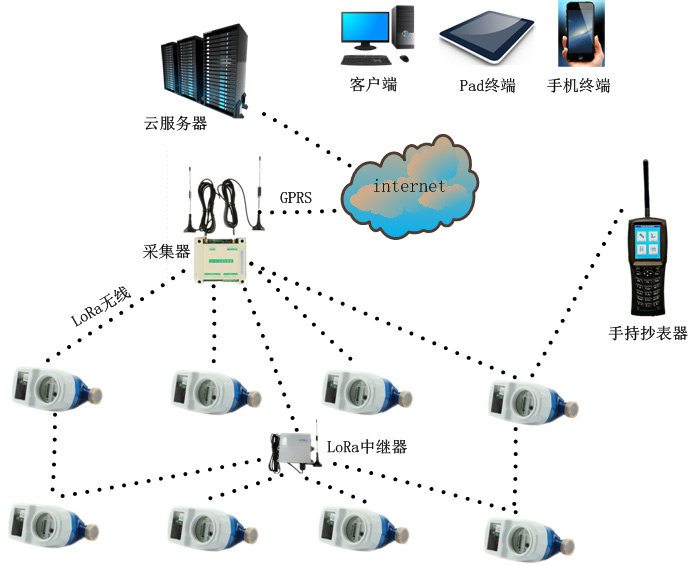 LoRa無(wú)線遠傳水表解(jiě)決方案由LoRa無線(xian)遠傳水表、LoRa無線(xian)中㊙️繼器、LoRa無線采(cǎi)集器/手持器、遠(yuan)程管理平台組(zǔ)成。